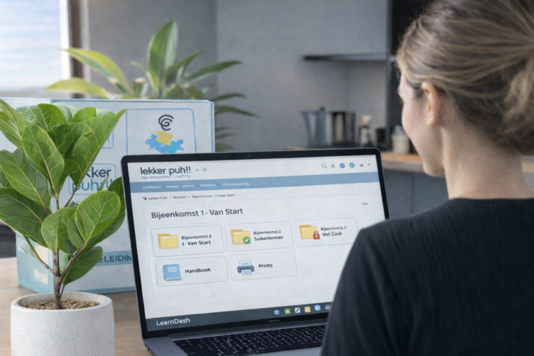 De professional heeft direct toegang tot de inhoud van de modules en bijeenkomsten, met daarnaast een stap-voor-stap handboek.